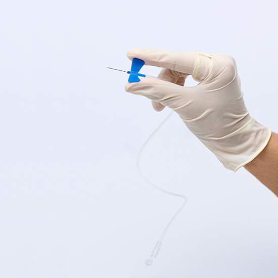 Material: aguja estéril de acero inoxidable, con protector de polipropileno y mariposa de PVC